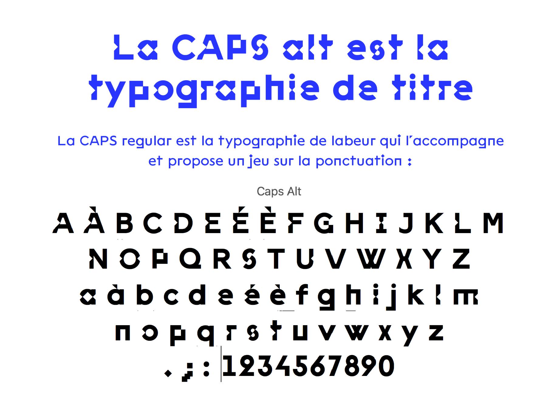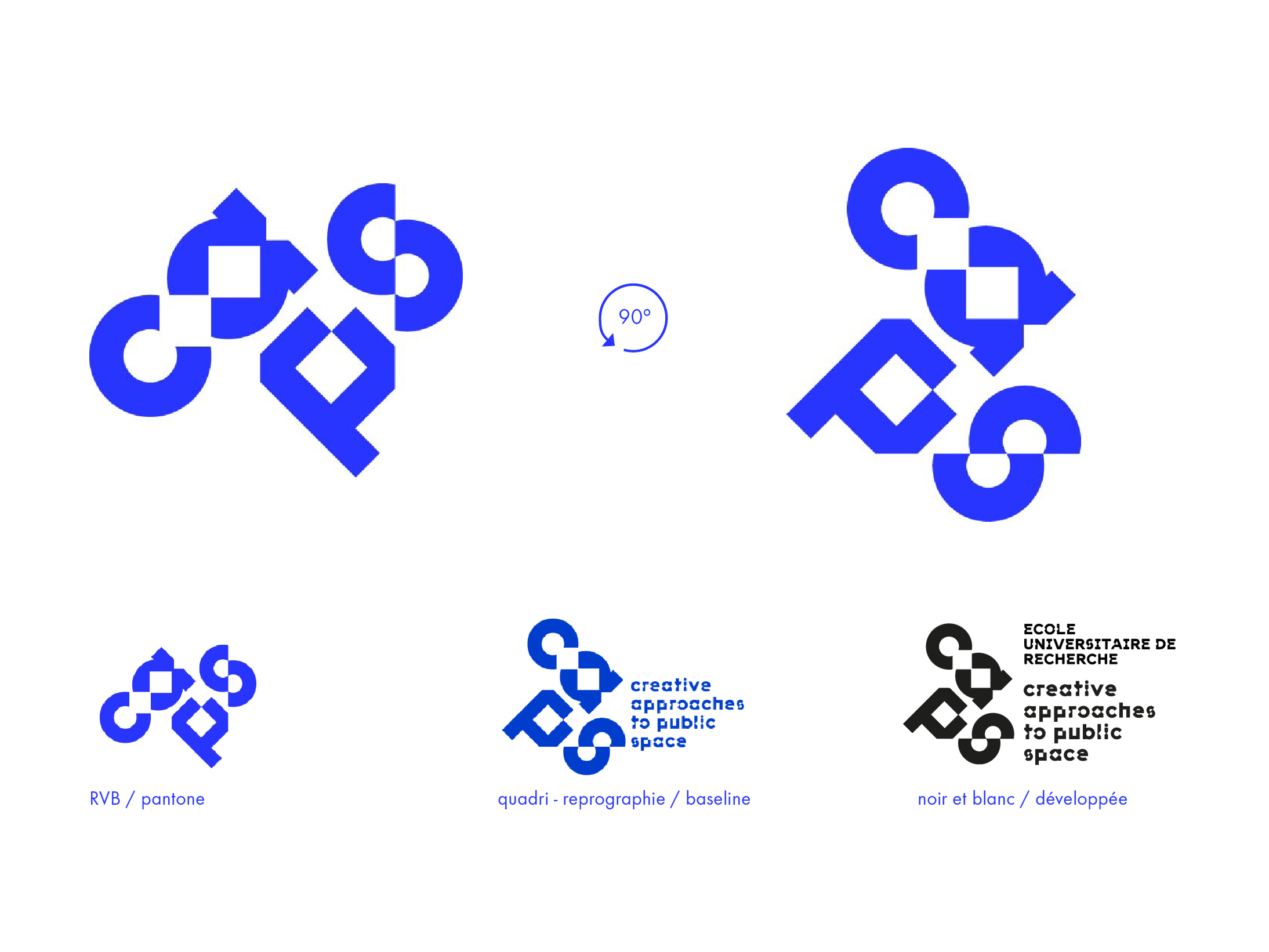Le système graphique s’appuie sur une typographie fortement identitaire conçue spécialement pour l’école de recherche. Elle permet dans des contextes d’usage très différents une persistance graphique, notamment sur les signes de ponctuation, tout en apportant une simplicité de mise en œuvre pour les usagers. Le dessin de signe de la version de titrage joue sur la figuration d’espaces blancs en losanges dans les contreformes et parfois entre les lettres qui figurent autant d’espaces de création à remplir tout en faisant comme scintiller la typographie.