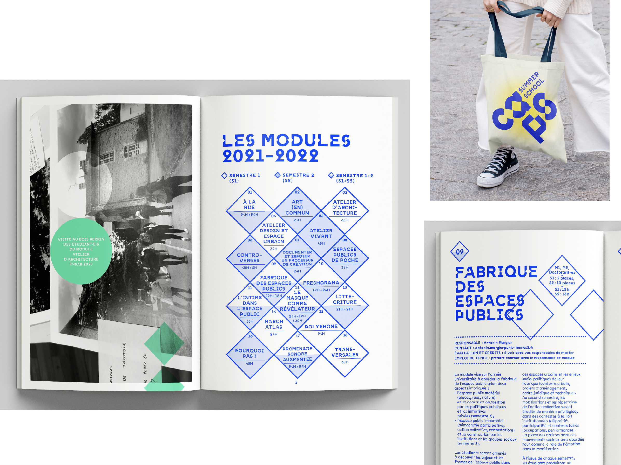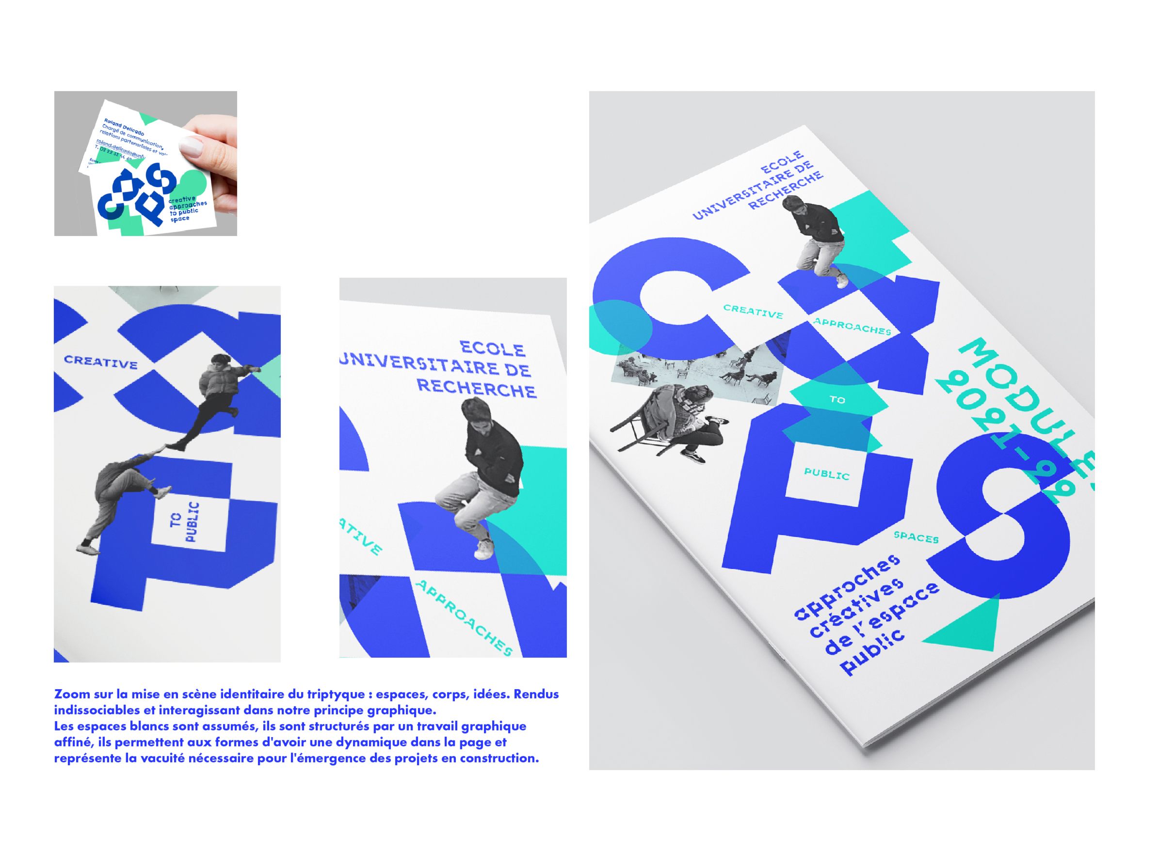 Des déclinaisons et supports d’édition jouent avec cette question de la spatialité mais aussi, via le collage, de l’idée de jeu et de faire, inhérents à ces pratiques situées ; un livret de formation, une pochette, des gabarits d’affiches ont été livrés ainsi qu’une boite à outils permettant à l’équipe de s’emparer de l’identité.
