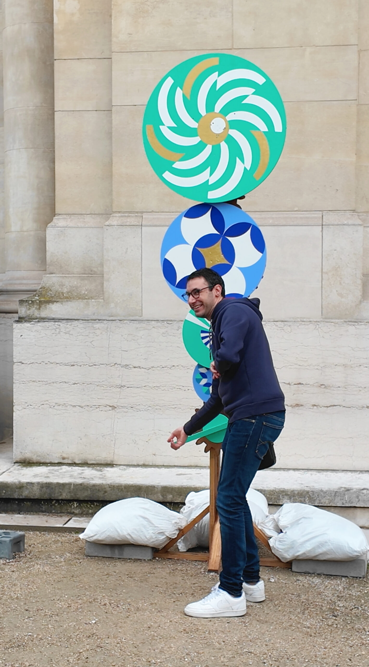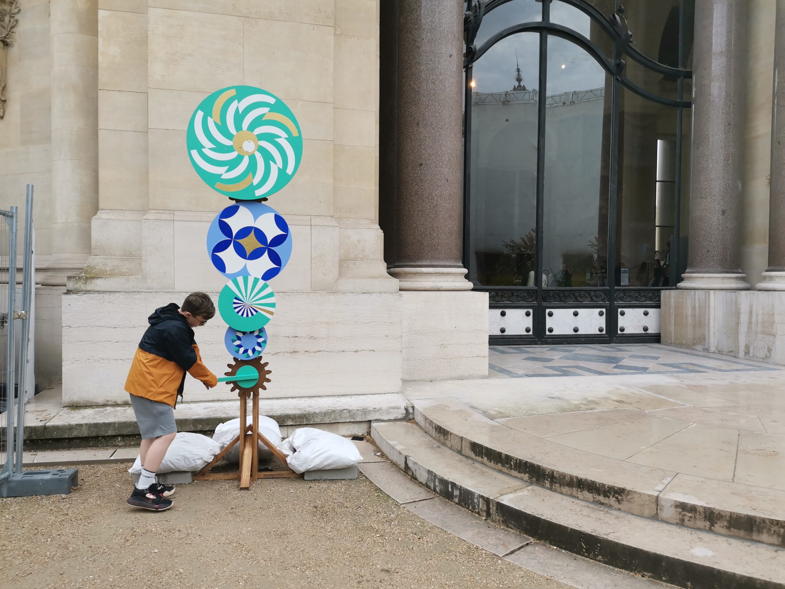 Une sculpture cinétique, s’est installée dans les jardins du Petit Palais pour les Journées du Patrimoine, invitant le public à expérimenter physiquement et visuellement les arts optiques et cinétiques. Ces formes graphiques mises en mouvement par le geste du visiteur l’invitent à regarder autrement, à percevoir le jardin comme un espace vivant, poétique et interactif. Une sculpture à jouer, activée par manivelle, qui offre un moment d’interaction, accessible à tous et toutes.