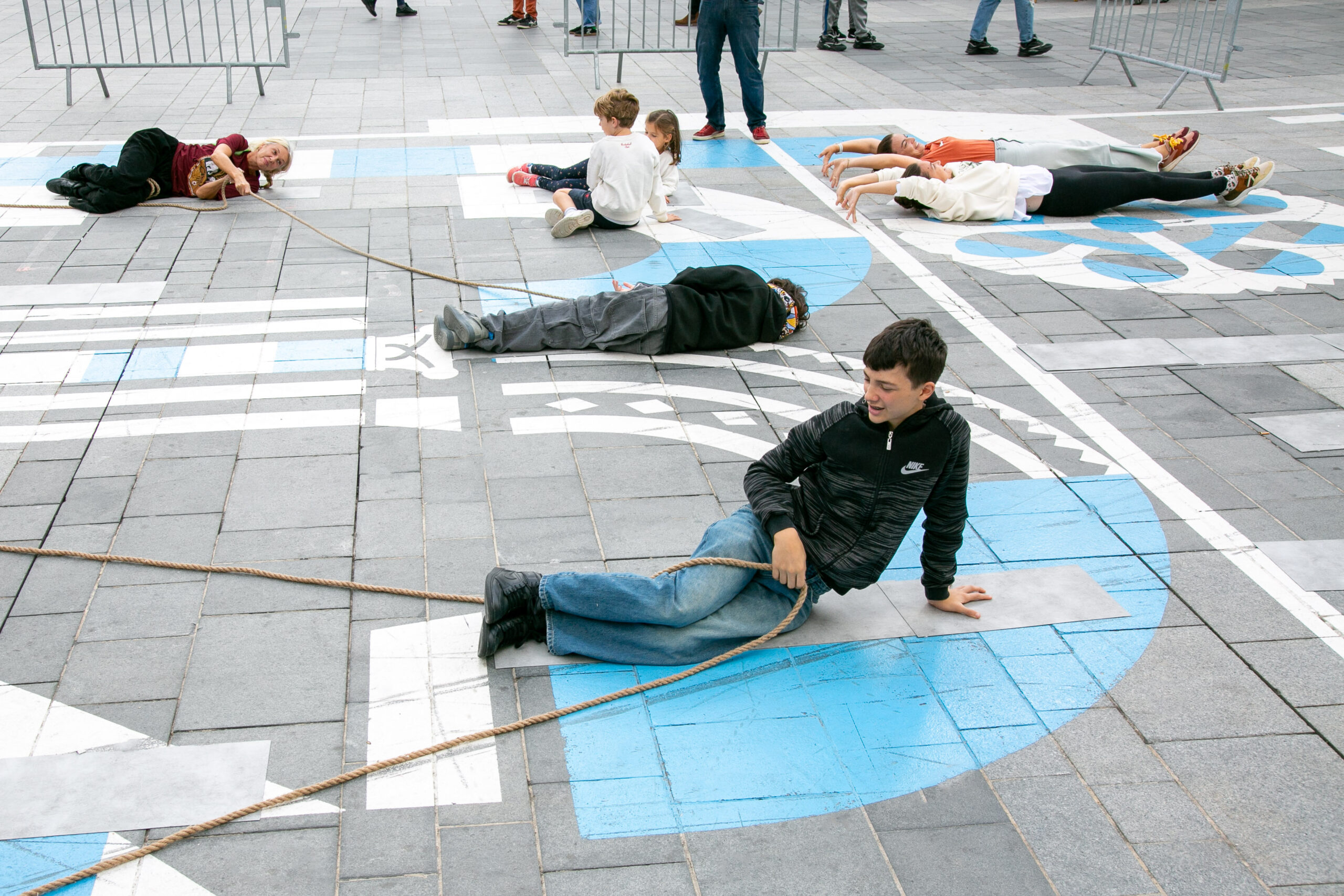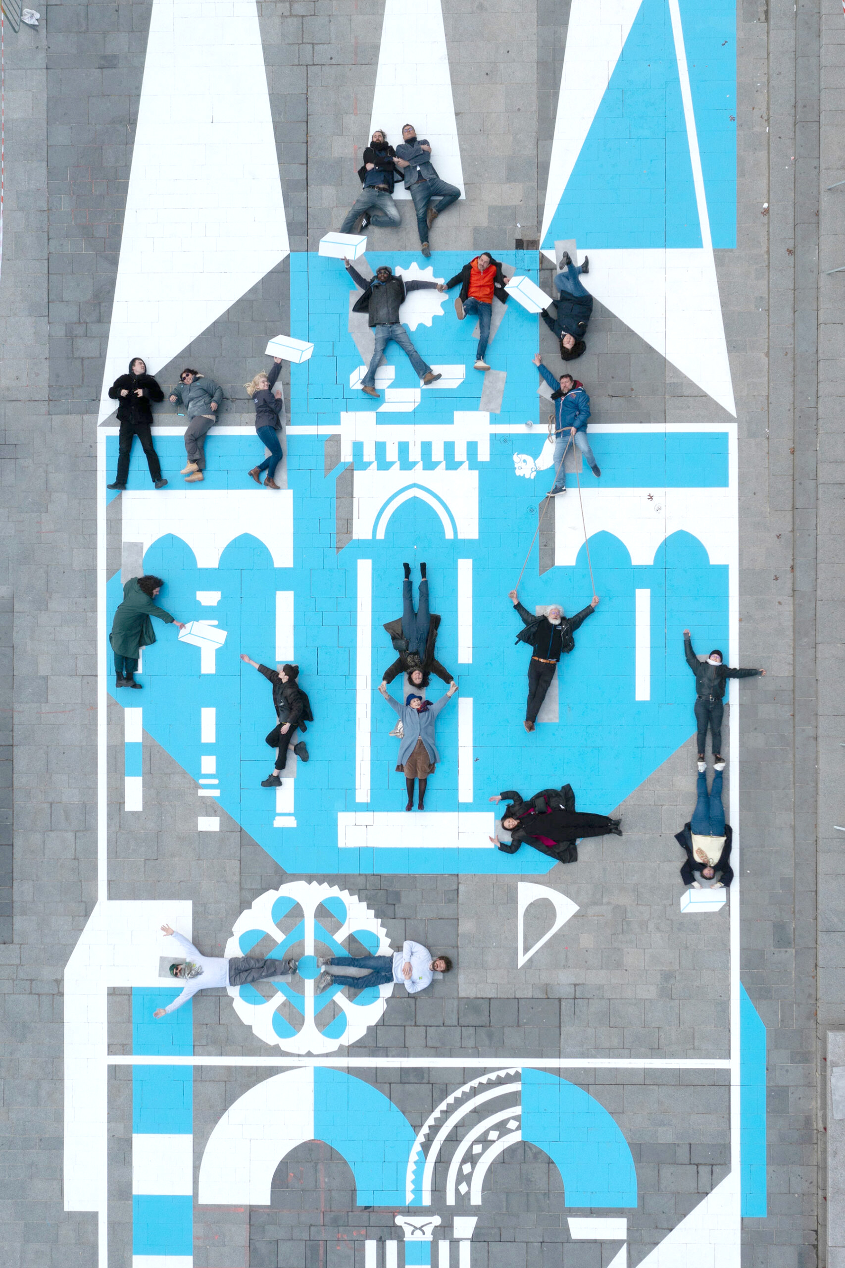 La flèche à l’échelle 1 se décline aussi dans les quartiers de Saint-Denis, via la réalisation de marquages et d’ateliers photographiques avec les habitants, et autour de « morceaux » de la future flèche réalisés eux aussi à l’échelle 1, comme un jeu de piste, pour que chacun puisse poser sa pierre et participer au projet :